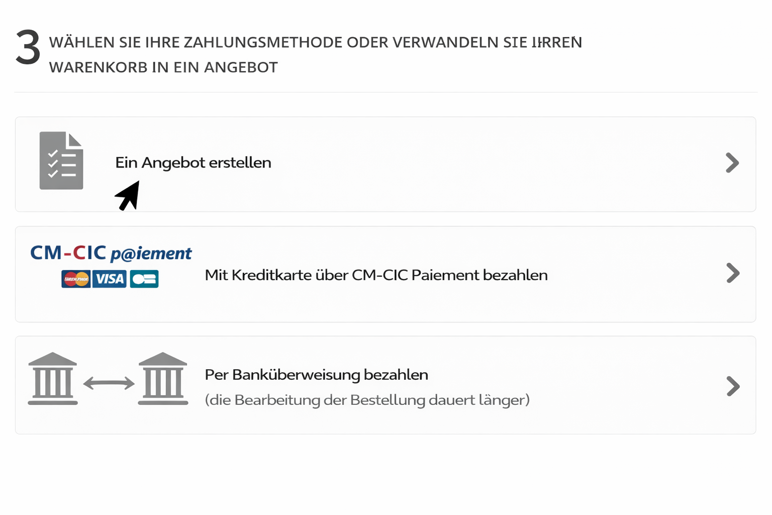 3. Wählen Sie bei der Auswahl der Zahlungsart anstelle Ihrer Zahlungsart die Option Angebot erstellen. Sie erhalten dann eine E-Mail mit Ihrem individuellen Angebot.