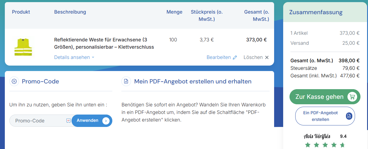 4. Anschließend finden Sie eine Zusammenfassung Ihres Kostenvoranschlags, den Sie endgültig bestätigen oder in eine Bestellung umwandeln können.
