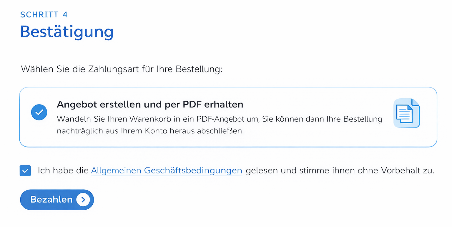 5. Geben Sie Ihre Daten ein, um Ihren Kostenvoranschlag abzuschließen: persönliche Angaben, Adressen, Liefermethoden. Anhand dieser Informationen können wir die Versandkosten für Ihren Kostenvoranschlag schätzen, insbesondere für Lieferungen außerhalb des französischen Festlands. Klicken Sie anschließend auf „Kostenvoranschlag erstellen und erhalten” und kreuzen Sie das Kästchen zur Annahme unserer Allgemeinen Geschäftsbedingungen an.