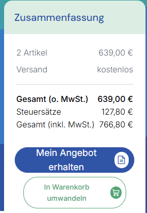 Um den Betrag Ihrer Artikel inklusive aller Steuern (inkl. MwSt.) anzuzeigen, gehen Sie bitte zu Ihrem Warenkorb. Am Ende der Bestellübersicht wird der Gesamtpreis inkl. MwSt. angezeigt.
